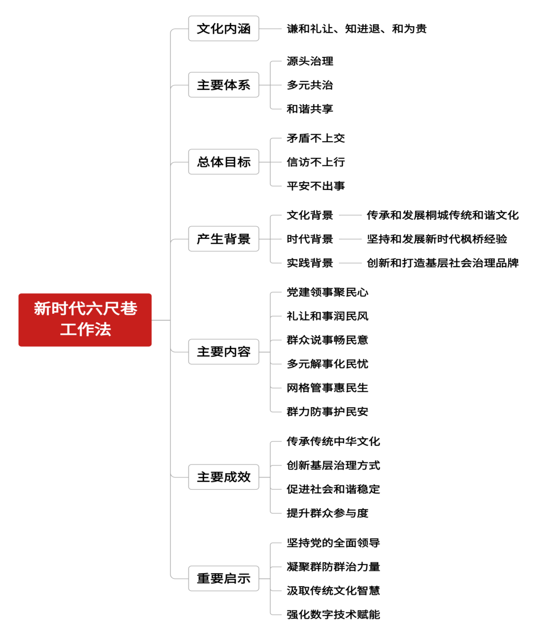 “新时代六尺巷工作法”是安徽省桐城市从得天独厚的优秀传统文化中汲取智慧,将六尺巷典故蕴含的“谦和礼让、知进退、和为贵”文化内涵注入基层治理,形成了以“源头治理、多元共治、和谐共享”为体系,以“矛盾不上交、信访不上行、平安不出事”为总体目标,以“党建领事、礼让和事、群众说事、多元解事、网格管事、群力防事”为主要内容的“新时代六尺巷工作法”,实现了矛盾纠纷总量、万人成讼率大幅下降,社会治安持续稳定。
