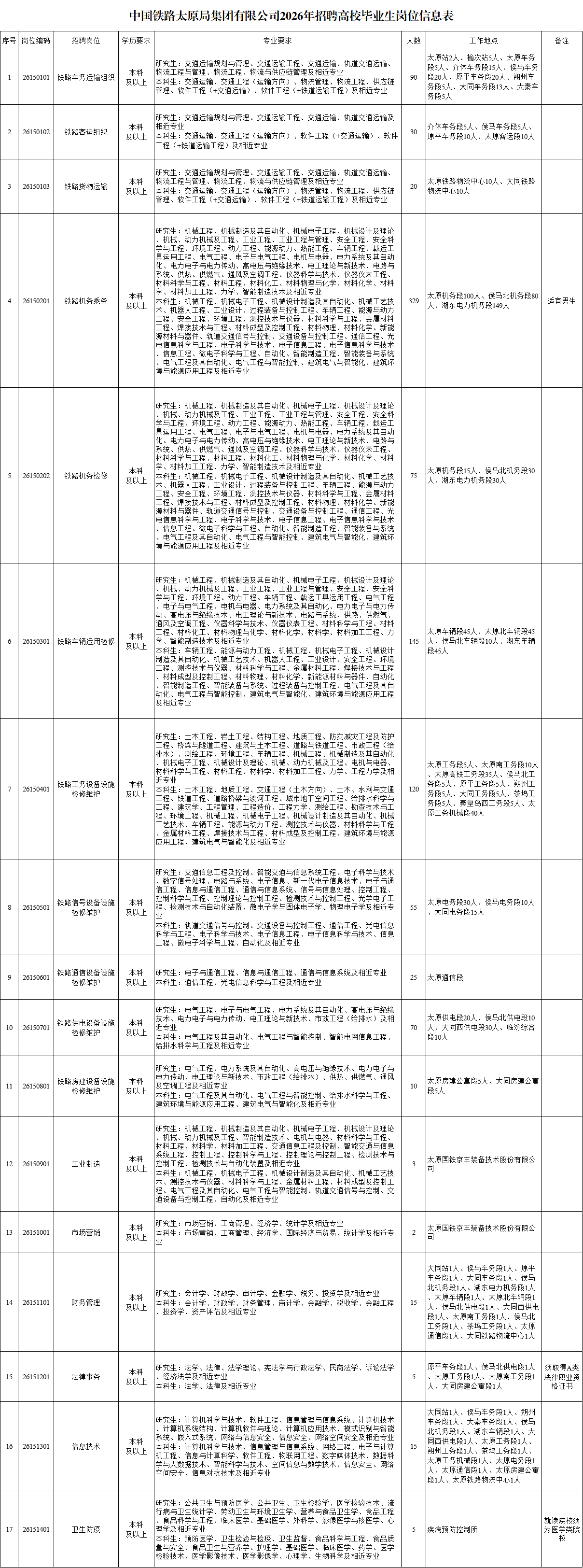 中国铁路太原局集团有限公司根据企业发展需要,现将2026年普通高等院校研究生和全日制本科学历毕业生招聘有关事项公告如下: