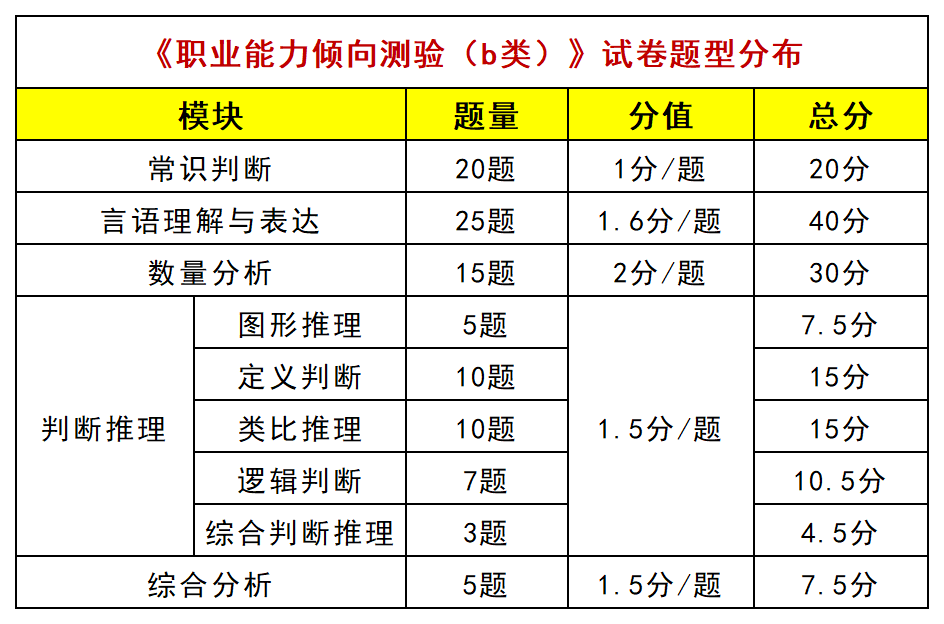 《职业能力倾向测验(B类)》是针对事业单位人文社科 类专业技术岗位公开招聘工作人员而设置的考试科目,主要测查与事业单位人文社科类专业技术岗位密切相关的、适合通过客观化纸笔测验方式进行考查的基本素质和能力要素,包括常识判断、言语理解与表达、数量分析、判断推理、综合分析等部分。一般是90分钟,100题,150分。